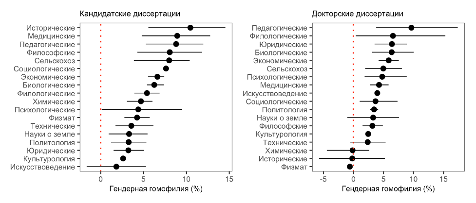 Младший научный сотрудник Елена Чечик опубликовала материал “В науке противоположности не притягиваются” на платформе Center for Independent Social Research USA (CISR US) с предварительными результатами текущего исследования защит кандидатских и докторских диссертаций в России. В основе исследования лежит проблема того, что женщины чаще, чем мужчины, расстаются с академической карьерой. Этот феномен называют «протекающим трубопроводом» (leaky pipeline). Одним из способов противостоять данной тенденции можно назвать наставничество. Логика такая: если вы – женщина и ваш наставник – женщина, то вы с большей вероятностью сможете удержаться в академической среде. Такое явление, когда женщины работают с женщинами, а мужчины с мужчинами, называют гендерной гомофилией.